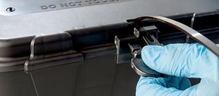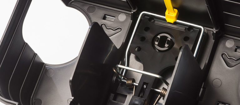 The indicator tie is attached to a strike bar inside the trap and extends out through an opening in the back of the station lid. Pulling the tie sets the trap. Once engaged, the black and yellow zip tie is clearly visible from the outside, making it easy to see if the trap is still set. When the trap goes off, the yellow disappears into the box, making it easy to know which traps have been tripped and need servicing.